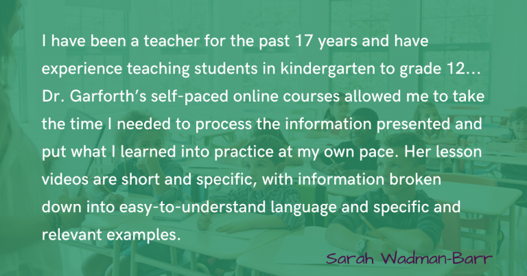 Dr. Garforth loves working one on one with families, helping discover the best way to support their child. She also recognizes there is lots to learn and has created online courses designed to help parents learn the things the books don’t cover.